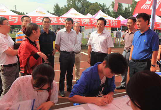 校领导一行分别到各个学院的新生报到处、体育馆、财务处等地,询问新生报到的进展情况。