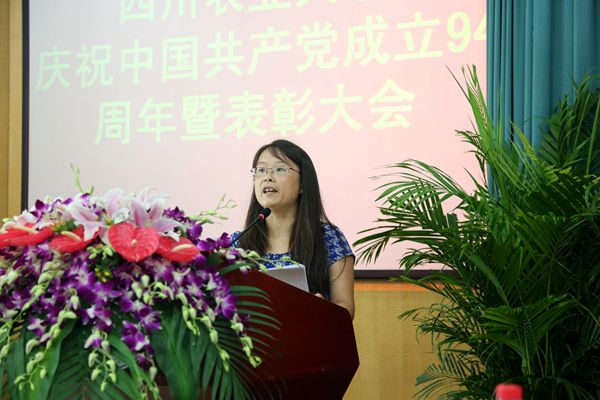 先进基层党组织代表、学校副校长、成都校区党委书记张强和动物营养研究所党委书记余冰,践行“三严三实”优秀党员领导干部代表、科技处处长曾维忠,教职工优秀共产党员代表、旅游学院郭凌老师,学生优秀共产党员代表、水利水电学院建环专业侯怡萍同学分别发言,对个人成长经历或单位获得先进的经验作了总结汇报,对党的培养和广大党员同志们给予的肯定和认可表示感谢,表达了将继续以“严”的精神、“实”的作风,发挥先锋模范带头作用,争创佳绩的决心。