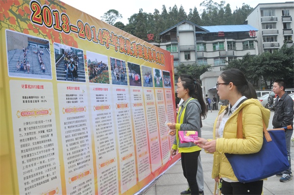 会场外,“收获的季节”2013—2014学年度优秀班集体和优秀个人风采展正在展出中。一幅幅展板图文并茂讲述了优秀班集体和优秀个人的事迹,吸引了不少师生驻足观看。2014级财务管理专业的许红说:“三个校区的同学的优秀情况都有介绍,我也特别想参加他们参加的活动,向他们学习。”