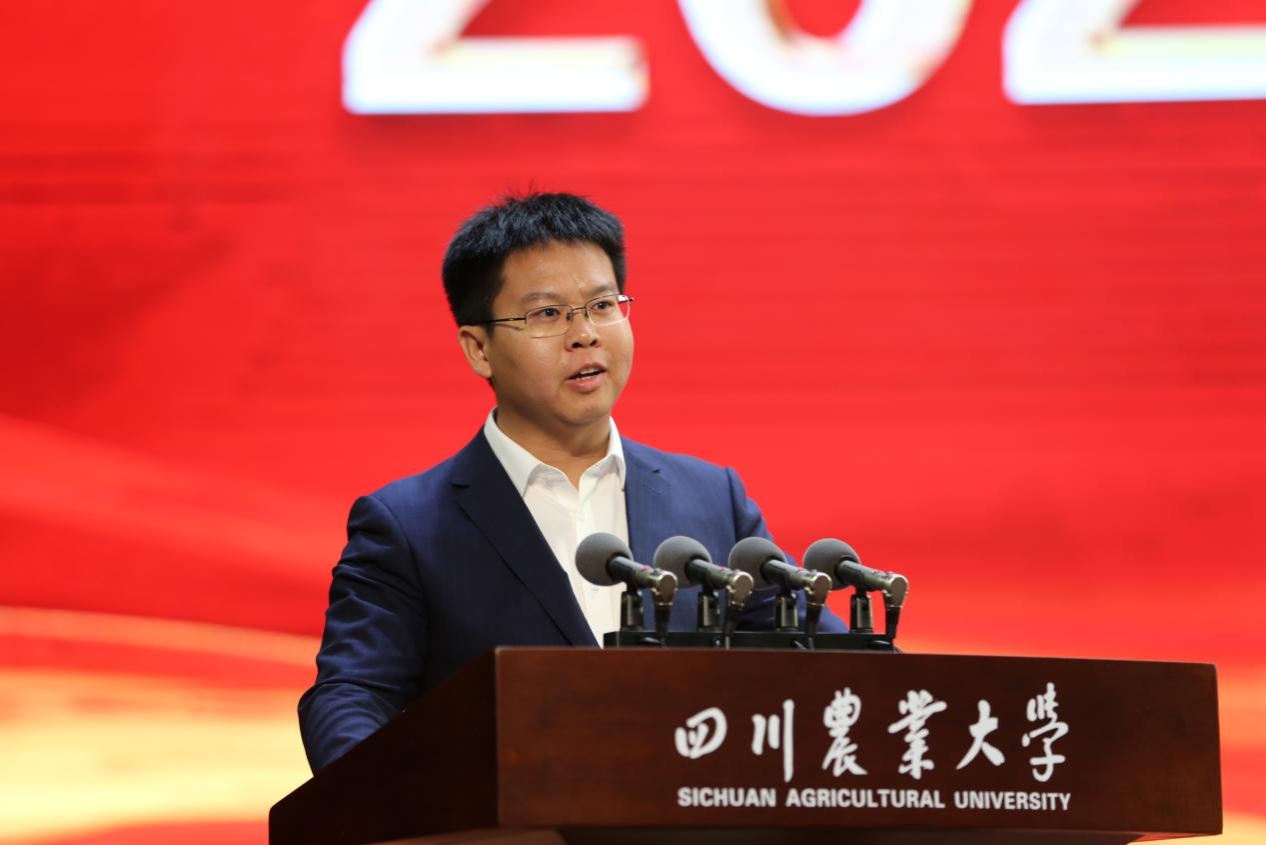 吴德鼓励同学们传承好川农大优秀基因,努力做新时代伟大理想的追梦人,伟大事业的生力军。他希望大家要坚守底色,表达好“爱国基因”,做爱国敬业的践行者。学校始终坚持把爱国主义教育和学科专业教育融入教书育人全领域全过程,为大家学好新时代党的创新理论,学好专业知识营造良好外部环境,真正帮助大家厚植爱农情怀、增长本事才干,为未来奉献国家、服务人民打下坚实基础。要彰显特色,表达好“苦辣基因”,做艰苦奋斗的奋进者。学校办学条件越来越好,同学们在校生活环境也越来越舒适。越是在这个时候,越要耐住寂寞、懂得自律,敢于吃苦、“自找苦吃”,以奋斗之精神克服学习之艰苦,用汗水成就幸福。要不改本色,表达好“协作基因”,做团结协作的领跑者。大家一定要明辨是非,学会从纷繁多变的信息中去伪存真,也一定要沟通交往,多参加集体活动、多与优秀者同行,以更加积极乐观的心态和富有激情的精神面貌,上好团结协作这门大学必修课。要保持亮色,表达好“创新基因”,做求实创新的开拓者。创新是时代发展的永恒主题,唯有养成独立思考的习惯,发扬严谨务实的作风,始终对探索新知和未知充满好奇心,对立足国际前沿充满自信与勇气,才能挖掘出自身的创新潜力,进而从优秀走向卓越。