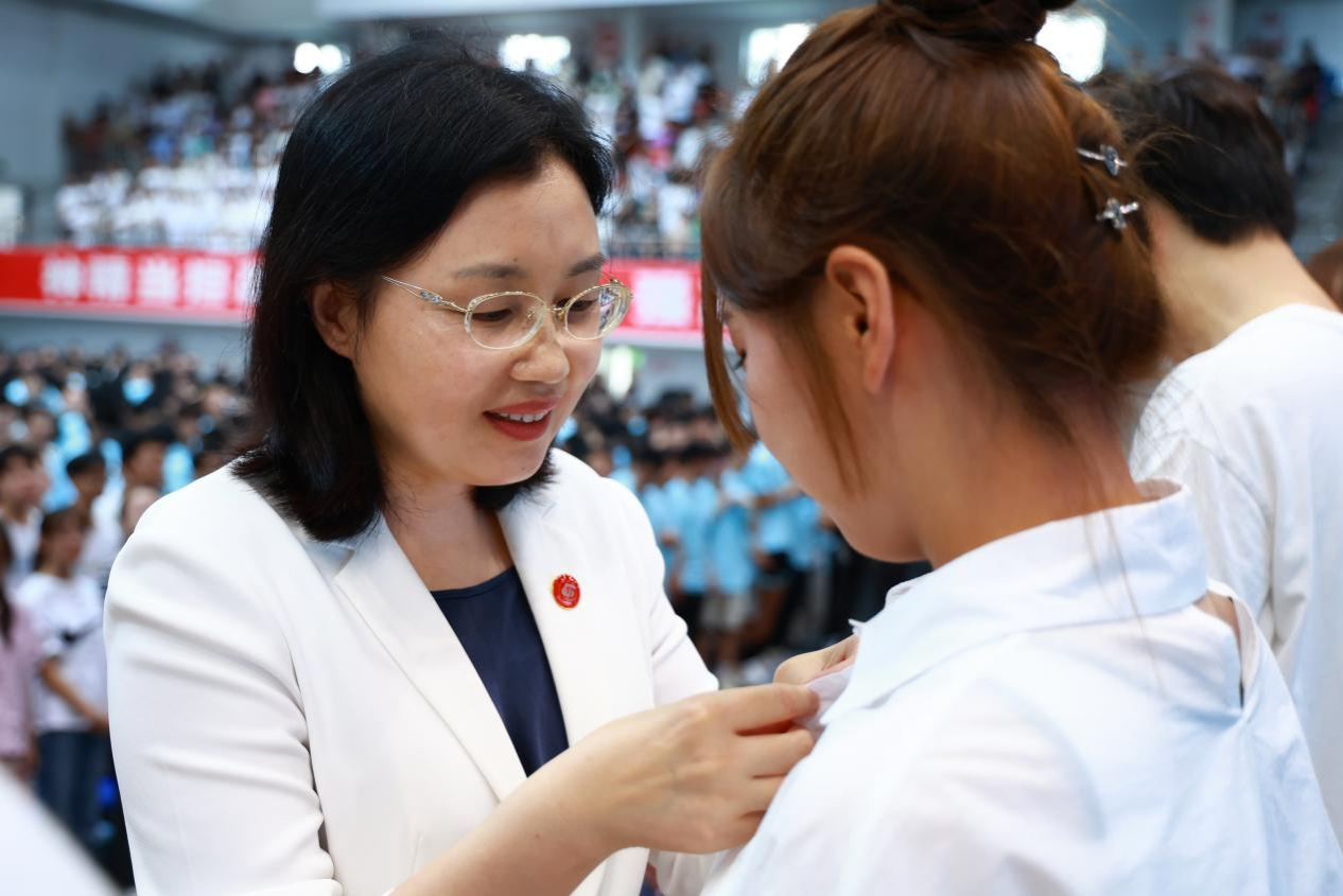 校党委书记庄天慧为新生代表佩戴校徽,欢迎同学们成为川农大家庭的一员。
