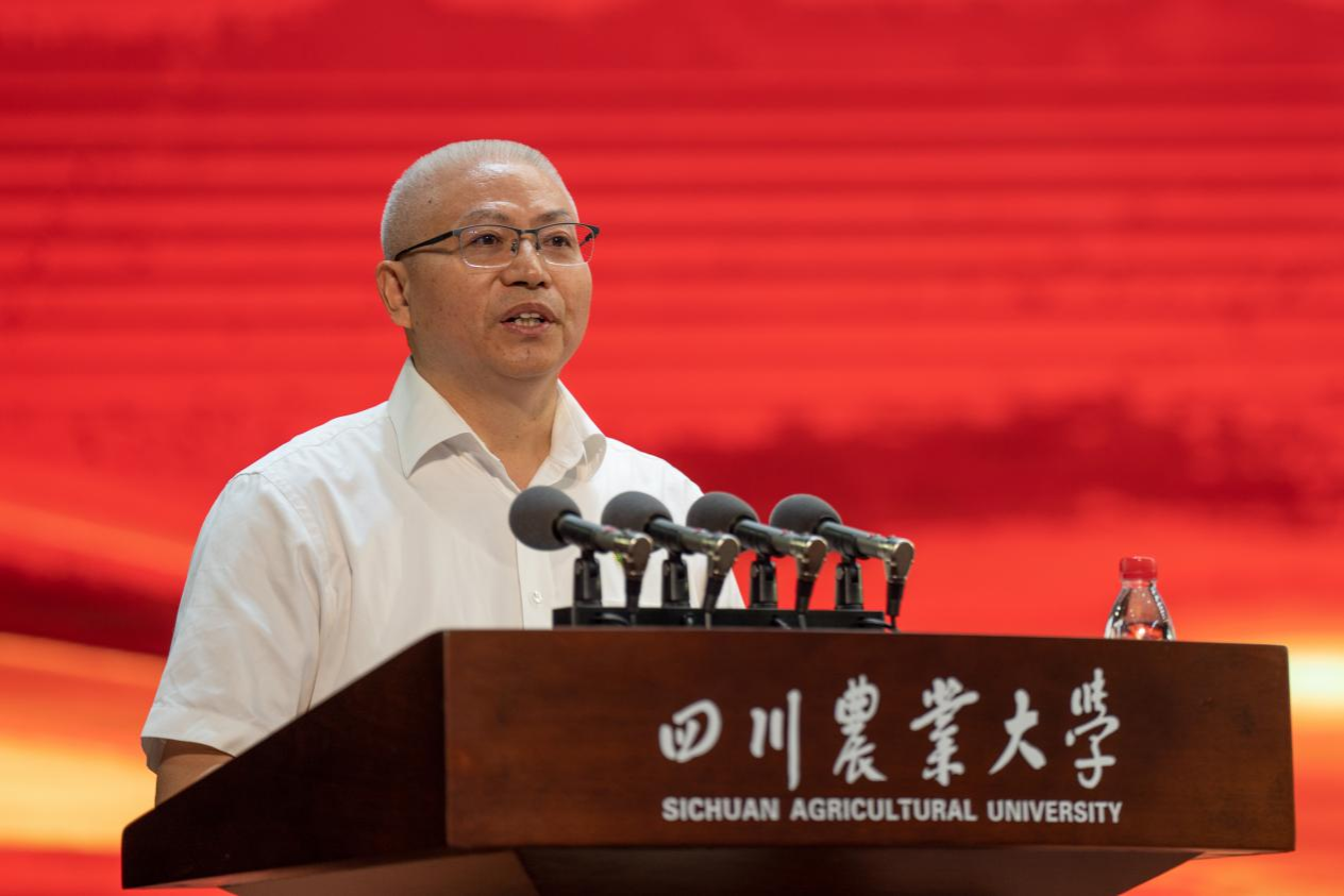 校长吴德向新同学们致以最衷心的祝贺和最热烈的欢迎!他满怀激动的通报了四川省委书记王晓晖在教师节来临之际来校慰问调研的情况。省委书记对学校工作给予了充分肯定,并对全校师生致以亲切的问候,这对川农大师生,特别是在座各位新同学都是极大的鼓舞和振奋。他简要介绍了2023级本科新生基本情况,并向他们讲述了一代代川农人为民族走向复兴、为国家繁荣富强、为“三农”进步发展而奉献不息、奋斗不止的传奇故事,深度解读了“川农大精神”中所蕴藏的川农大基因:“爱国基因”和“创新基因”如同DNA双螺旋的两条支链,“苦辣基因”和“协作基因”如同链接2条支链的氢键,共同组成了“川农大精神”的DNA。