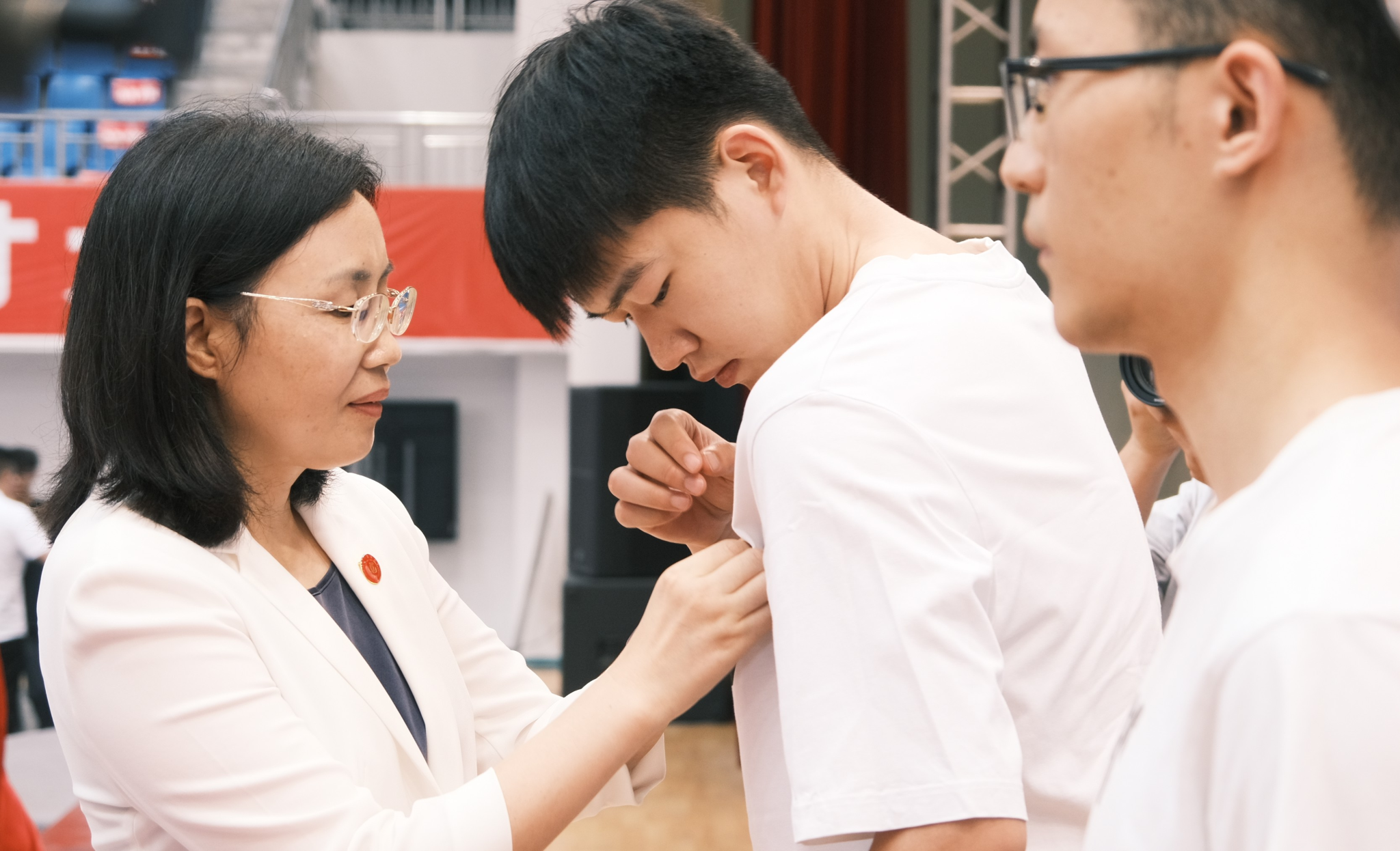 党委书记庄天慧为新生代表佩戴上校徽,欢迎大家加入川农大家庭。