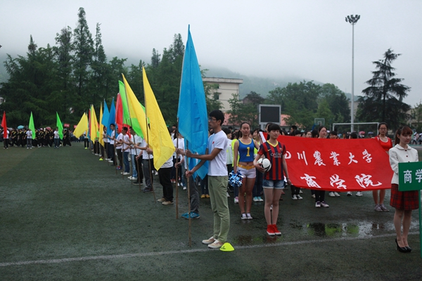 天公不作美,雨一直在下,彩旗队们举着旗,在雨中笔直地立着,就像北方道路两旁抵御风沙的白杨树,默默无闻的守护着,奉献着。他们穿着短袖,无处雨水流过他们的脸颊,寒冷侵袭他们的身体。他们站在操场的正中间,站在表演队的身后,默默举着迎风飞扬的彩旗,依旧是绿茵场上亮丽的风景。