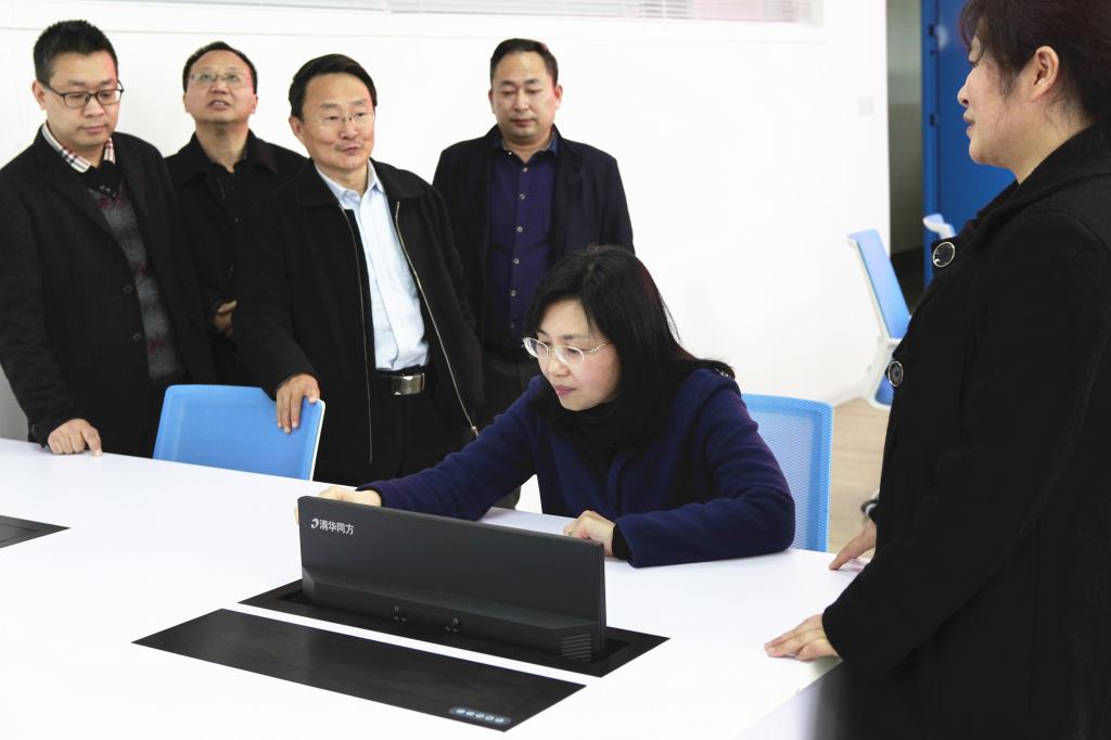 庄天慧来到商学院企业虚拟仿真实训中心,看到崭新的实验室非常高兴,并亲自动手操作体验。