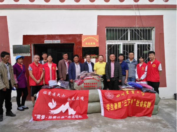 “简爱•与子同袍”志愿者团队在四川省残联组联处处副处长许万忠、成都市残疾人福利基金会熊猫爱心箱项目负责人韦华等人带领下,前往阿坝藏族羌族自治州小金县日尔乡四大安村进行“熊猫爱心箱”项目物资捐赠暨开展“简爱•与子同袍”三下乡暑期社会实践活动。在小金县日尔乡四大安村,“简爱•与子同袍”受到了乡、村领导及村民们的热情接待。志愿者团队与四大安村委会进行了捐赠衣物的交接,并与村领导商议了衣物的具体发放等问题。随后,志愿者团队一行人前往日尔乡政府,就乡上贫困户的具体情况与当地干部进行了深入交谈,以更好的完善今后的物资捐赠活动。