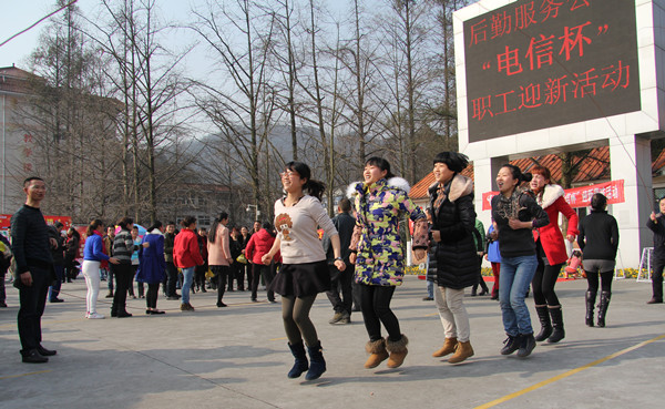 1月21日下午,后勤服务公司携手都江堰市电信公司在都江堰校区活动中心广场LED屏幕前举办了“电信杯”迎新年趣味活动。