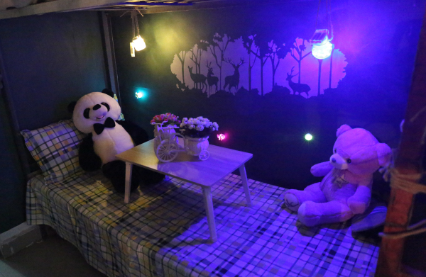 评委们根据寝室地面卫生与墙面装饰,被盖、床单、枕头及蚊帐的整理,书籍及洗漱用品的摆放,寝室整体视觉效果和将绿色环保理念运用于宿舍生活,运用废弃鞋盒、饮料瓶、荧光棒、卡片等物品制作的小台灯、小饰品中蕴含的创意与智慧等项进行分别评分和成绩汇总,最后8公寓210等18间寝室分获内务整理一、二、三等奖,7公寓211等7间寝室获得废物利用“最佳智慧奖”。