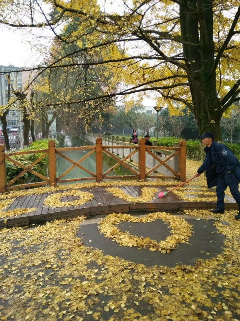 连续的阴雨天散去,又是到都江堰校区赏银杏的最好时节。从11月19日以来刷遍朋友圈的,是都江堰校区一张张川农保安李樑用扫把将银杏叶堆成的“LOVE”和爱心的图片。此事也受到华西都市报、成都最校园等微媒体关注。网友直呼“川农最文艺的保安大叔 !”“好漂亮的校园,好暖心的大叔!”