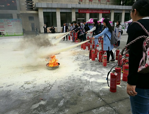 随后,校区保卫部配合消防员在活动中心门口组织了消防实战演练。经过培训,在场的每一名师生都学会了正确使用灭火器的方法。