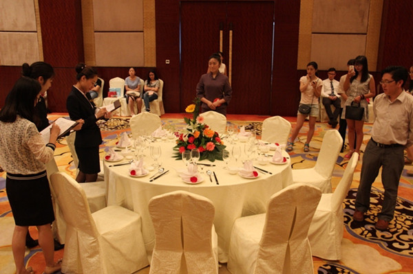 本次比赛项目有中餐宴会摆台、西餐宴会摆台、中式铺床、英式调酒、酒店专业英语考核等。每位选手分别要进行仪容仪表展示、现场操作、理论知识考核、酒店英语考核等环节,选手的最后成绩是四项项目分值所占比例的总和。