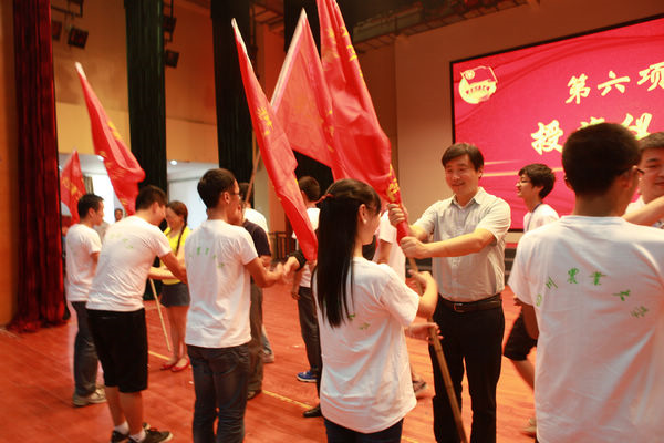 出席仪式的领导们为社会实践团队代表授旗,刘川宣布英国365(集团)公司官方网站2013学生暑期“三下乡”社会实践出征,李静波对参加暑期设计实践的同学们提出希望和要求。