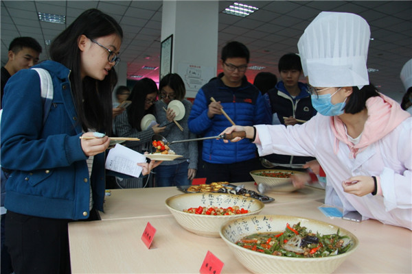 活动中,银杏餐厅、柳苑餐厅共推出20余道菜品,每位厨师参评的菜品从用料、味型及烹饪方式上各展特色,橙汁豆腐色泽金黄、入口果香味浓郁、酸甜可口,吃过之后会不由感叹豆腐还可以做成这样的美食,鲜椒霸王鸡肉质细嫩爽口、青花椒和红二荆条的重口味搭配让食者的味蕾刺激与享受。由微观川农”、“川农后勤”微信公众号推送及现场报名共计200余名学生评委,纷纷用手机记录下餐厅师傅们巧手下的妙品,同学们有序地一一品尝师傅们的菜品。