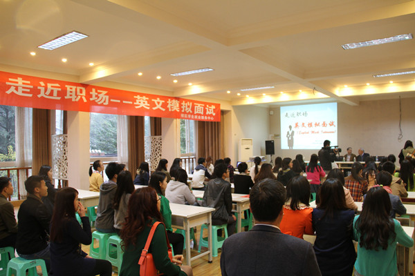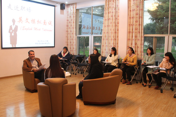 在模拟面试环节,4位美国各界专家以他们的外企阅历,提供了全真外企模拟面试,48位同学经过筛选参与面试。Guy.Amstrong简要地介绍了外企面试的要求后,同学们分列四组,开始了1对1的面试。模拟面试中,美国专家为同学们提出了面试时态度热情自信,充分了解公司和自身的长短处,回答问题时准确清晰等建议。同学们提出的困惑,专家们也都耐心解答。