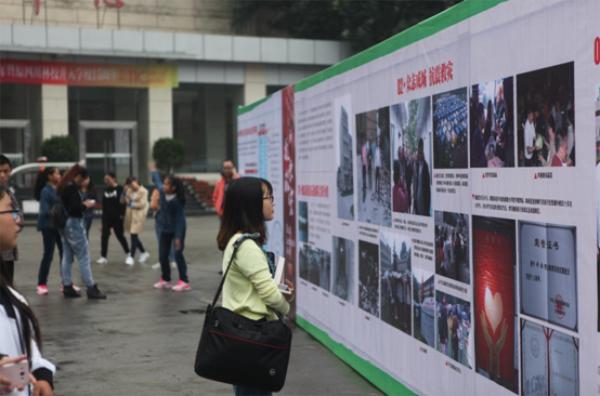 围绕着都江堰校区操场,110米长的桁架上,一组《都江堰校区的追赶与跨越》大型图片展,吸引了不少人前来观看。