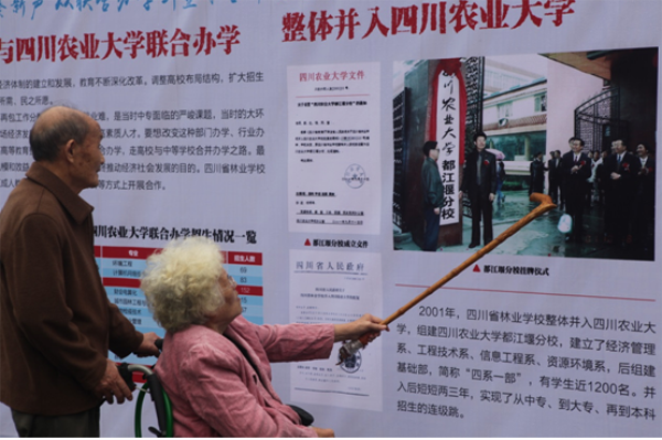 一位头发斑白的老人推着轮椅,一边用拐棍在图片上点一边给同行的老伴讲解。她是1954年林业经营专业的毕业生唐可丽。在收到川农110年校庆邀请函后,即使身体不便,依然坚持回到川农,带着真挚的祝福为母校庆生。她满怀期望地对我们说:“希望川农大越来越好,你们也都越来越好!”