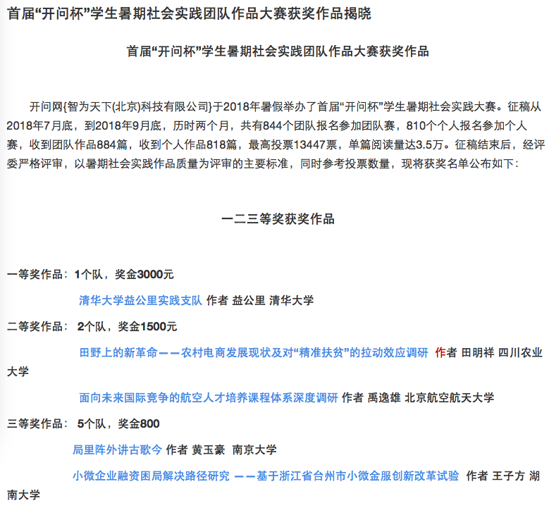 据悉,2018年首届“开问杯”学生暑期社会实践团队作品大赛是由开问网主办,本次大赛面向全国所有参加暑期社会实践的团队或个人,征稿从2018年7月底在网上开始,到2018年9月底结束,历时两个月,共有844个团队报名参加团队赛,810位个人报名参加个人赛,收到团队作品884篇,收到个人作品818篇,最高投票13447票,单篇阅读量达3.5万。