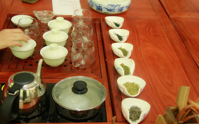 何春雷带来的不同种类的黄茶被一一盛放进茶荷里,再分别由学员们欣赏、品鉴,观察茶叶的外形,细闻干茶的香气,品鉴茶汤带给我们的不同感受。何教授春雷的研究生为学员们示范泡茶工艺,然后学员们再自行冲泡。此次茶艺课冲泡、品鉴的茶主要有:黄毛峰、皇茗园、浦江金茶、跃华黄茶、万春黄茶以及米仓山6种黄茶,通过对各种黄茶外形、汤色、香气、滋味及叶底的对比,学员们更近一步了解了黄茶。