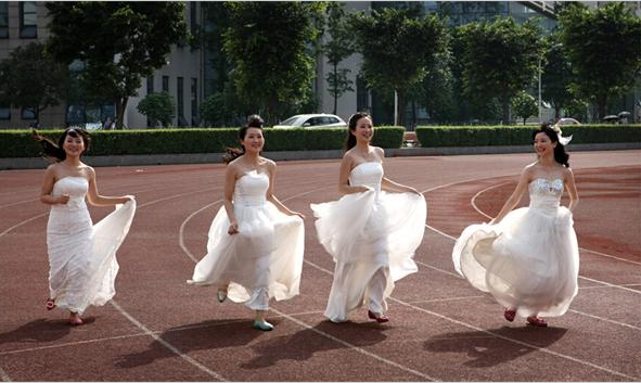 从操场到四教、从麦立方到图书馆……两套不同的婚纱,两款不同的风格,却是一样的心情——她们把对校园的怀恋和友谊留在了一张张相片里。