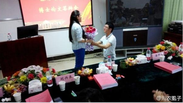 6月4日,林学院博士生周义贵在论文答辩现场表现极佳,其女友也在现场为他鼓劲加油。当周义贵顺利完成答辩、致谢了恩师等人之后,突然说:“我有一个重大的事情宣布!现在我要邀请我最重要的人分享我今天的喜悦!”大家的目光在一片惊讶中随着他移动,他将女友请上了到了播放PPT的大屏幕前,从同学手上接过玫瑰花,高高举起手中的戒指,单膝跪地虔诚地说:“你愿意嫁给我吗?”