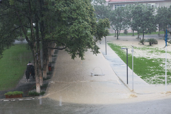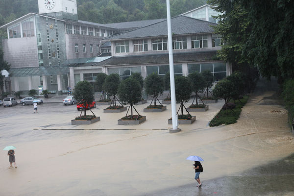 为了不影响正常的期末考试,校区领导、相关部门负责人以及后勤服务公司职工第一时间赶到东区宿舍等受灾严重地方,疏通地下排水管,并在东区宿舍区垒砌沙袋,确保学生安全。在第一教学楼等地方拉起警戒线,打开排水井盖,并派人站岗疏导学生,保证正常的教学秩序和师生员工的生命财产安全。