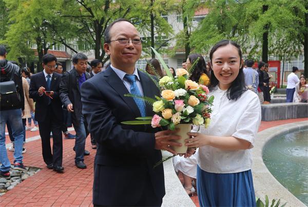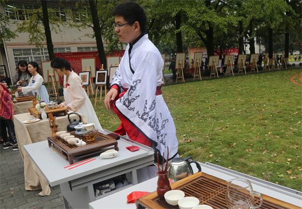 10月7日,都江堰校区校园里浓郁的文化气息吸引了全体校领导和大批校友们。他们走近可爱的同学们,近距离欣赏大家的插花作品、绘画作品、茶艺表演、手工艺品,品尝现场调制的鸡尾酒,并与前来参加活动的嘉宾们合影留念。