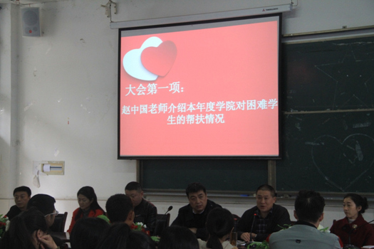 赵中国介绍了商学院持续开展的暧冬行动对贫困学生的帮扶情况。他强调,同学们生活虽然有一定困难,但国家、学校、学院及老师始终在关心着你们,并通过各种方式在助力你们的学习,并已取得很好的效果。同学们一定要有一个积极乐观的心态,肯吃苦,不怕艰难,在学习中不要有侥幸的投机取巧心理,常怀一颗感恩的心,更加努力学习,以良好的学业报答社会、老师及父母对自己培养。