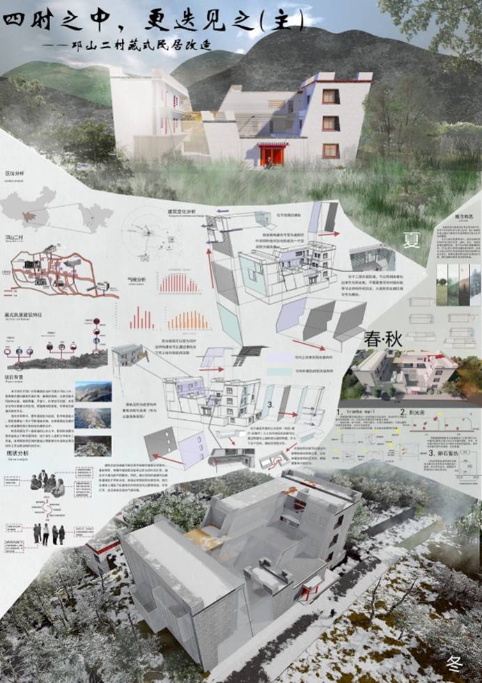钟可盈同学团队以“烟汀山居-通江县泥溪乡梨园坝院落改造”为题,描绘了川东北传统村落保护和更新的美丽蓝图。李雪飞同学团队以“四时之中,更迭见之-川西北藏式民居改造”为题,强调可再生能源(太阳能、风能)在民居室内环境改善设计中的作用,为乡村振兴中的传统村落和民居建设提供了技术支撑。同时也凸显了我校建筑学专业一直以来坚持的办学特色“乡村”、“绿色”,紧扣国家和时代需求,服务乡村,让乡村更美好。