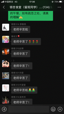 “老师们送餐辛苦了!”、“今天立冬,感觉这个冬天特别温暖……”、“在留观宾馆里还能点餐真的太方便了,食堂的菜品也很赞!”11月7日,刚刚成立的“银杏食堂(留观同学)送餐”微信群里热闹无比,都江堰校区生活中心办实事、暖人心,每日为留观同学提供个性化订餐服务受到同学们的一致点赞!