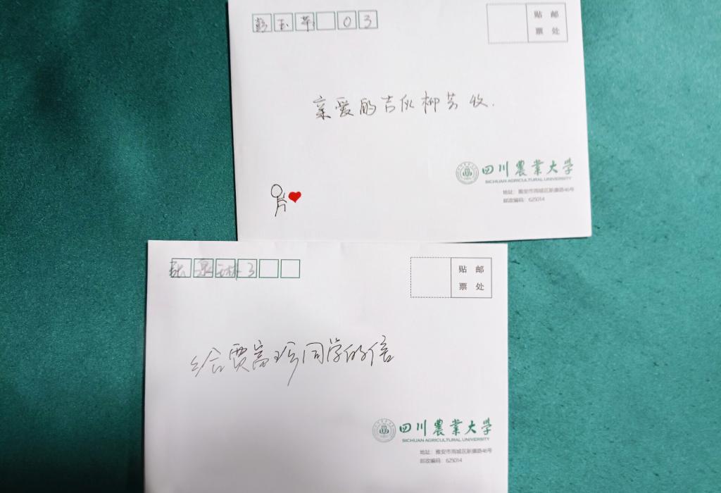 “爱国敬业,艰苦奋斗,团结拼搏,求实创新”,由都江堰校区团委学生实践与志愿服务中心精心设计的,印有“川农大精神”的信纸上饱含对同学们期望。手绘、贴纸明信片和精致的卡片等等,更将每一个信封与信纸都装点得精美且独一无二。