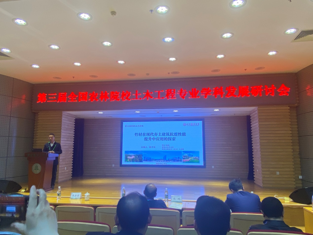 郭子红以《竹材在现代夯土建筑抗震性能提升中应用的探索》为题做主题报告,报告了我校土木工程教师围绕服务乡村振兴开展的工作,展现了我校土木工程的村镇建设办学特色和强农兴农的己任担当。