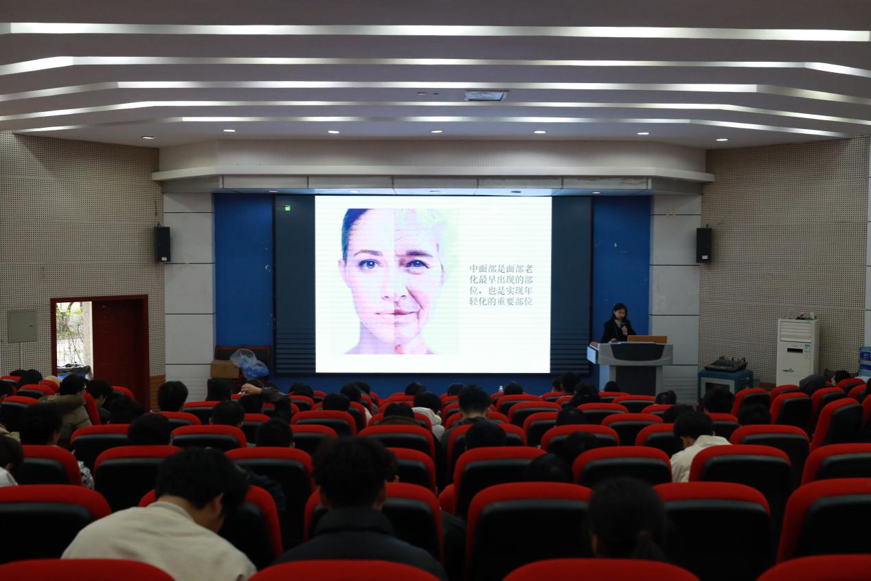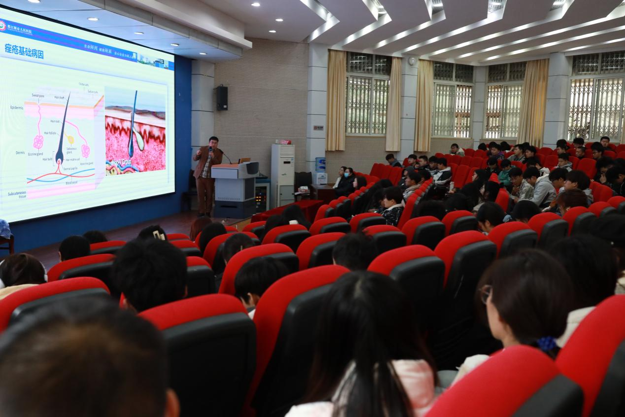 8日下午,在4101教室,都江堰市医疗中心皮肤科宁旭医生用专业的角度向200余名师生介绍了痤疮的基础病因和药物治疗,强调了随意挤压青春痘的危害性和规律作息对皮肤的重要性。张雨佳医生着重介绍了面部老化、医美和美容护肤,张医生就她擅长的光子嫩肤、水光注射等面部年轻化项目和激光治疗各种色素皮肤病等方面为现场师生做了全面的讲解。现场很多师生结合自身情况,就护肤和预防皮肤病等方面进行了提问,两位医生就提问给出了详细解答。现场的师生们纷纷表示讲座内容有很强的实用性,使他们不仅增长了护肤知识,纠正了许多美容错误,而且对处理常见皮肤病有了更深入的了解。
