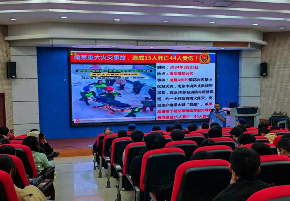 在安全知识讲座环节,袁海涛教官以其丰富的实战经验和生动的案例,为师生量身打造了一场消防安全知识盛宴。内容涵盖了消防法、案例警示及安全生产责任,办公室、实验室、学生寝室、家庭的火灾预防及隐患排查,灭火、逃生、自救技能及演练。通过震撼人心的火灾现场视频及触目惊心的图片资料,深刻剖析了近期发生的消防安全事故,让在场的每一位听众都深切感受到火灾的无情与残酷,进而认识到防范火灾的极端重要性和紧迫性。他诙谐幽默的讲解,时刻提醒大家在享受安宁生活的同时,也要时刻保持警惕,做到“预防为主,防消结合”。