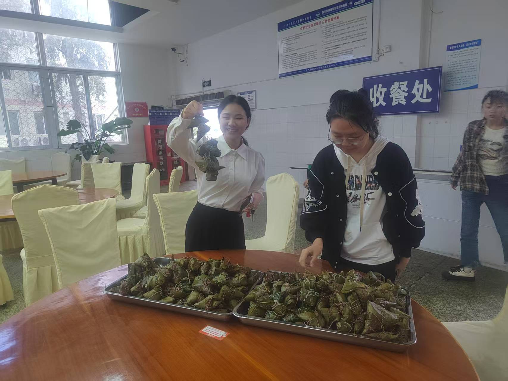 5 月 27 日,都江堰校区组织系列活动让师生在体验包粽、收获互动乐趣中感受传统文化魅力,为服务育人注入活力。数十名师生在都江堰校区柳苑餐厅跟随师傅学习包粽子,用粽叶、糯米、蜜枣等材料制作三角粽等个性粽型。现场粽香四溢,成品蒸煮完成后分发给了参与活动的师生。5 月 30 日银杏餐厅一楼开展“端午赠粽” 活动,向就餐同学赠送粽子,并设置端午知识问答卡趣味竞答,参与者可赢取小礼品。