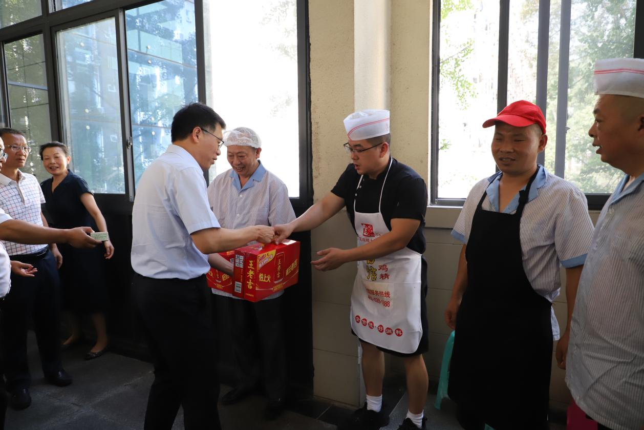 7月30日,学校副校长李德海来到都江堰校区,亲切看望慰问在高温酷暑下依然坚守岗位、辛勤工作的一线干部职工,代表学校向他们致以诚挚的问候和衷心的感谢,并送上防暑降温慰问品。都江堰校区英国365(集团)公司官方网站班子成员及相关科室负责人陪同慰问。