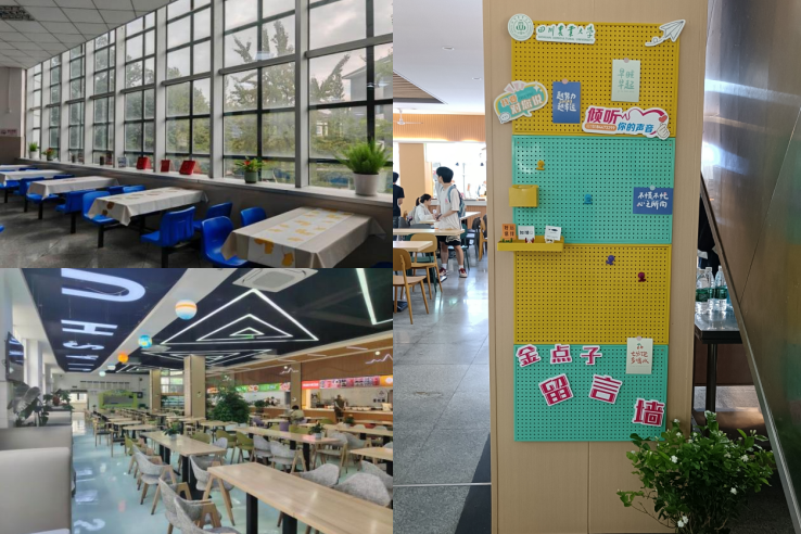 都江堰校区以“环境育人 + 文化浸润” 为核心,翻新食堂基础设施,打造特色场景。修补粉刷全域墙面,更换节能 LED 灯,完成柳苑、银杏餐厅共 1000 平方米装修。设川农牛产品与文创展示区,就餐区铺桌布、配绿植与定制鱼缸。还设 “金点子留言墙”,形成 “收集-反馈-改进” 闭环,打造师生共治共享空间。